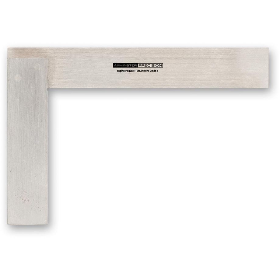 An engineer's square gives you four 90° angles: internal, external, outside blade to inside stock and inside blade to outside stock. Compare this to a carpenter's try square which only guarantees accuracy on the internal angle. Our engineer's squares comprise a stainless steel blade, triple riveted into a steel stock. The hardened and tempered blade and the high quality steel stock are ground and polished for accuracy. Final polishing makes the rivets virtually invisible. Axminster Professional Engineer's squares conform to DIN875/II, guaranteed square and straight. The size stated is from the inner edge of the stock to the tip of the blade. The small notch on the inside corner of the square prevents accumulations of dust and dirt, small burrs or saw whiskers on the workpiece affecting the accuracy of the reading. Supplied in a foam lined case. N.B The blade measurements given are the inner diameter of the blade.