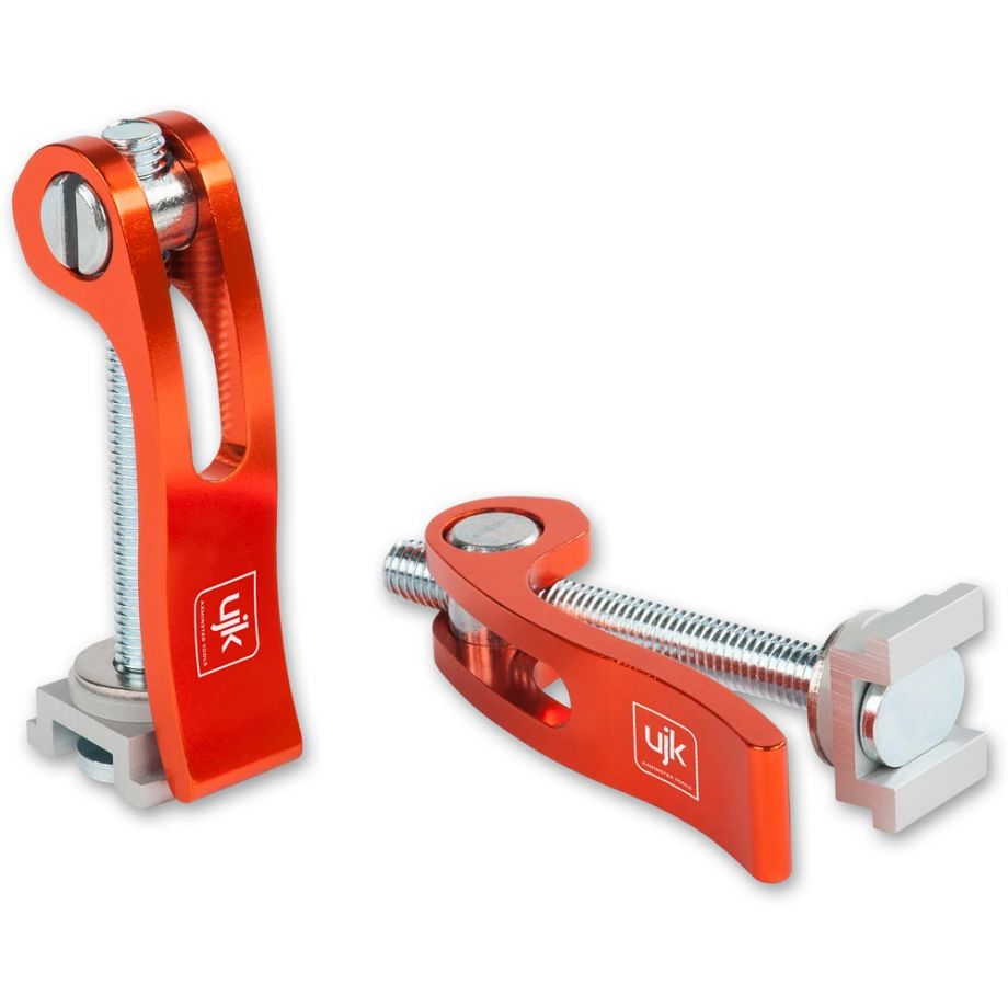 Supplied in packs of two, the UJK Cam Lock Hold Down Clamp offers ultra fast lock and quick release for all manner of fixtures and fences. They are easy to use, self-locking and exert plenty of force. The M8 x 75mm, T-bolt is compatible with the UJK T-Track. Obviously, by substituting the T-bolt for a regular M8 bolt you have the option of using the Cam Lock wherever you wish.