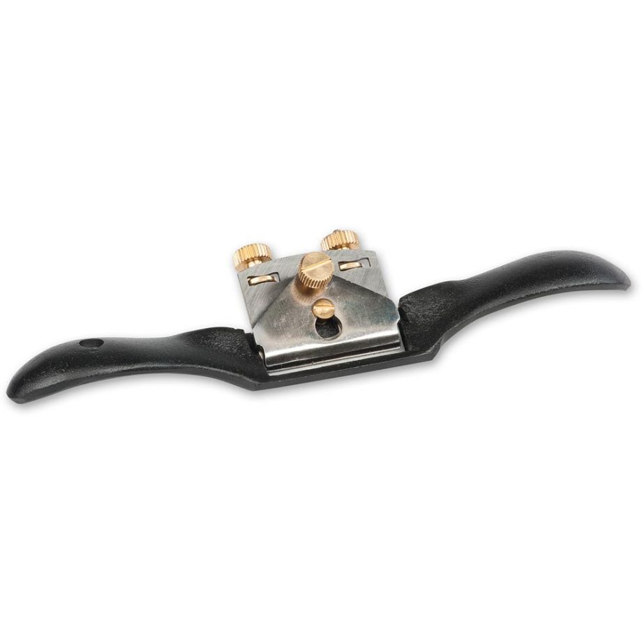This traditional style, Rider spokeshave has a curved sole, designed for cutting and refining concave curves. The spokeshave body is ductile cast iron, with a tough black enamel finish. The well-rounded handles and thumb rests offer comfort and control when cutting. Twin knurled adjusting screws control both depth and lateral adjustment of the 55 mm(2.1/8") wide blade. This adjustment allows a very fine setting for delicate work. The O1 steel blade is oil quenched, hardened and tempered to HRC 63, and only requires a little honing before use.